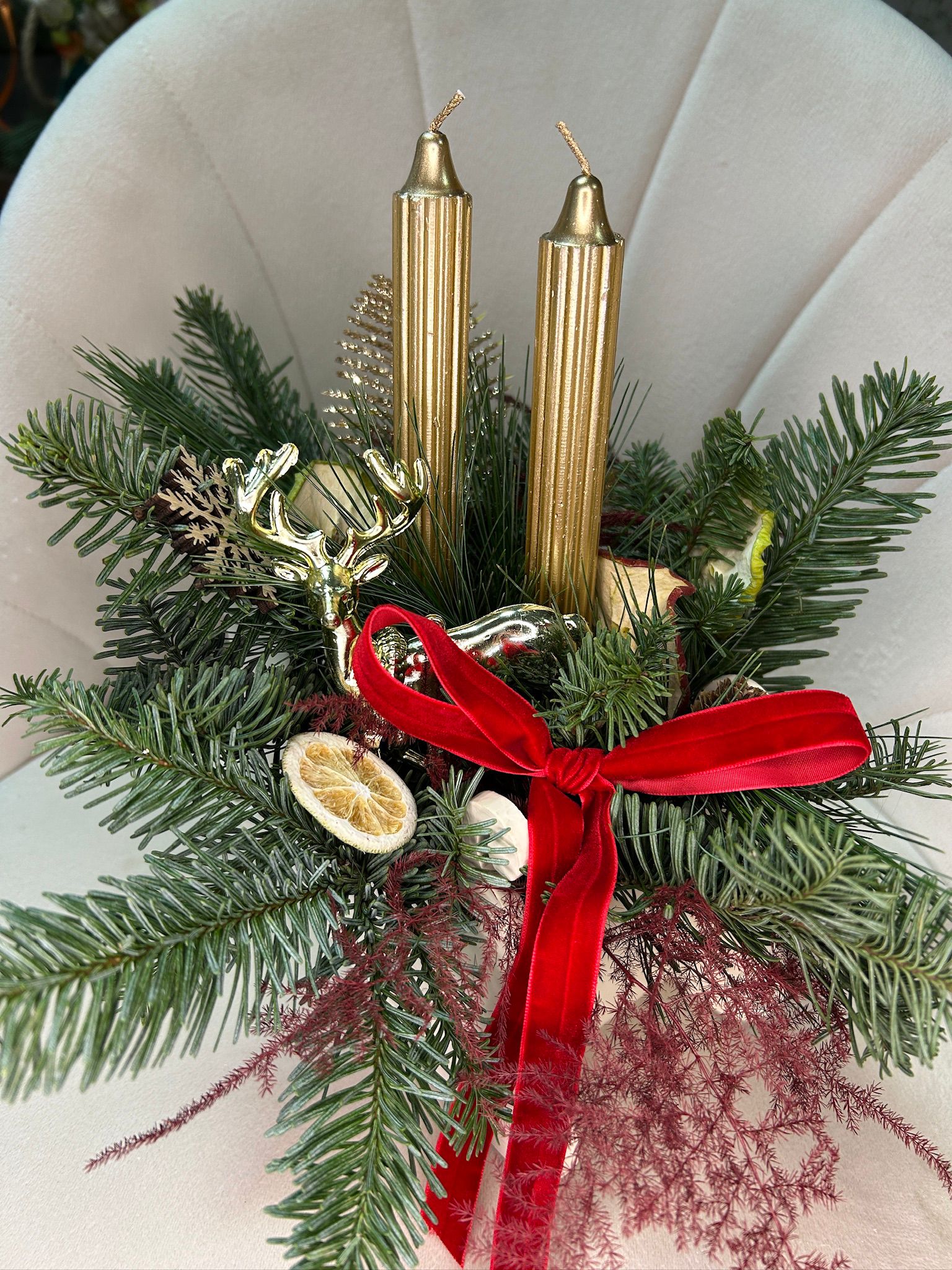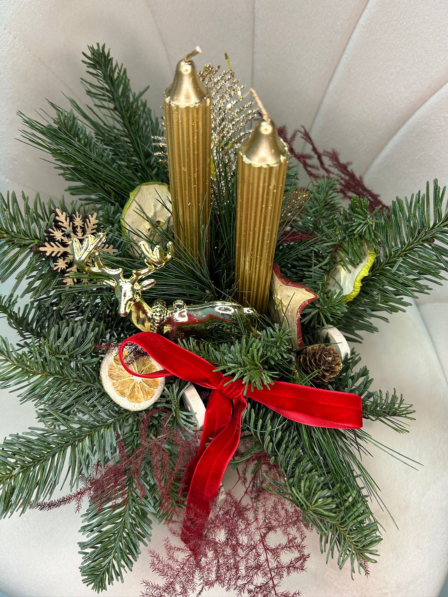 Aranjamentul de Crăciun este realizat din ramuri naturale de brad, decorat cu două lumânări aurii elegante, figurină ren, con de brad, accente aurii și fundă roșie catifelată. Felii de citrice uscate și detaliile festive completează un design clasic, cald și rafinat, ideal pentru masa de sărbători sau decorul casei.