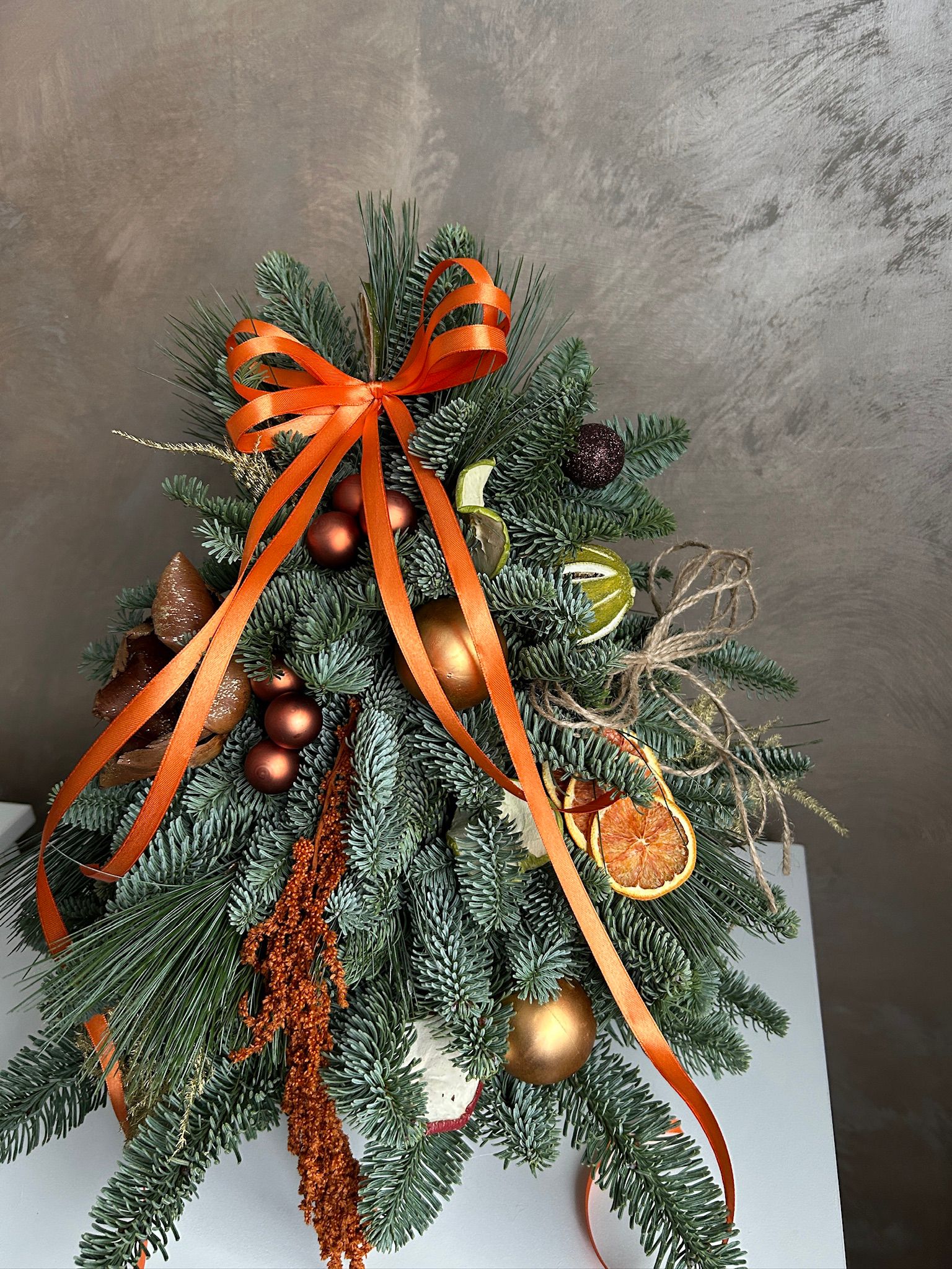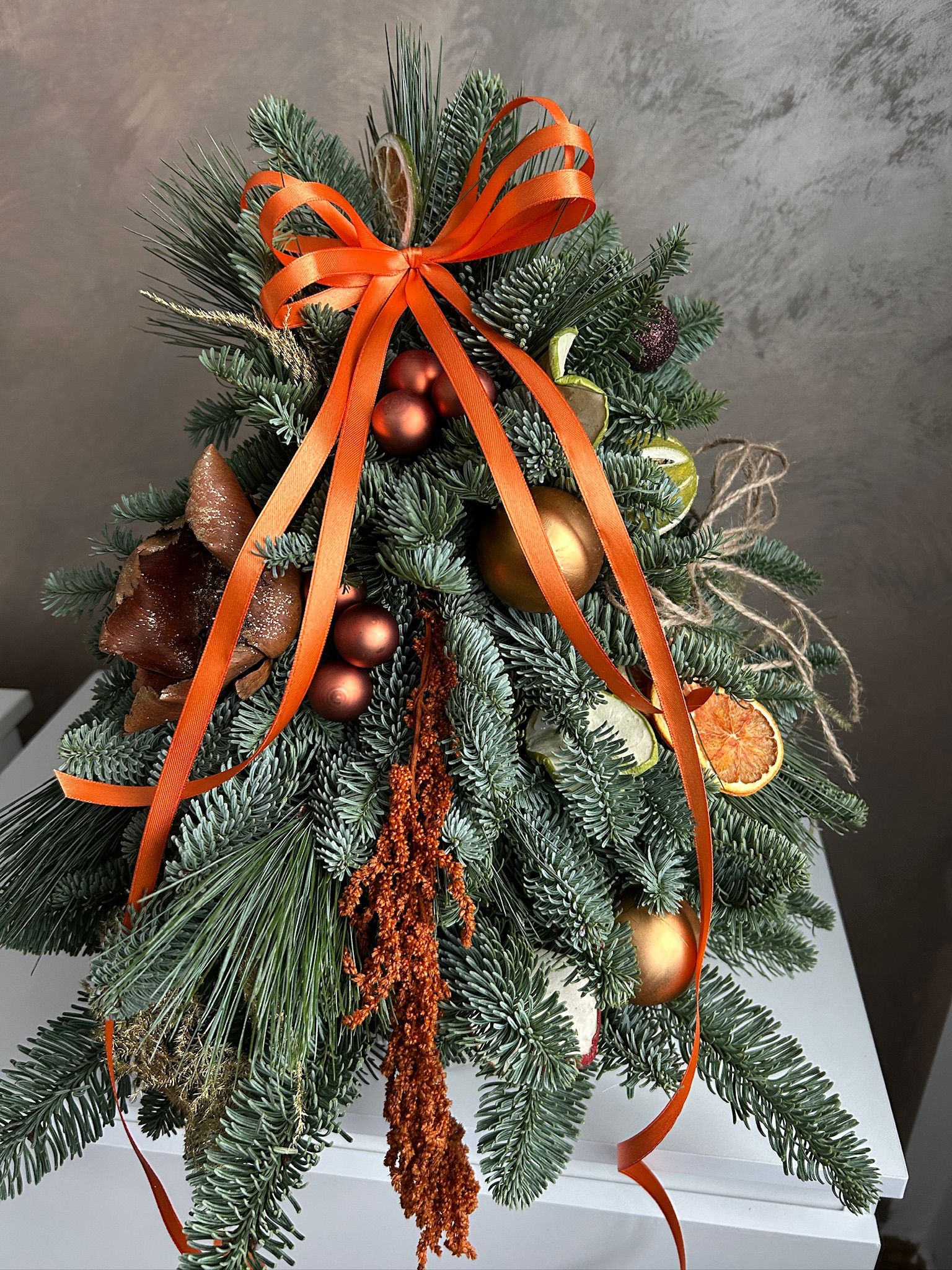 Brad Gold este un aranjament festiv realizat din ramuri proaspete de brad, decorat cu globuri aurii, elemente naturale și fundă satinată în nuanțe calde, oferind un aspect sofisticat și modern. Perfect pentru decorarea mesei de Crăciun, recepției, biroului sau ca idee de cadou special, acest brad aduce un plus de eleganță și rafinament oricărui spațiu.
